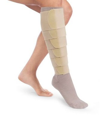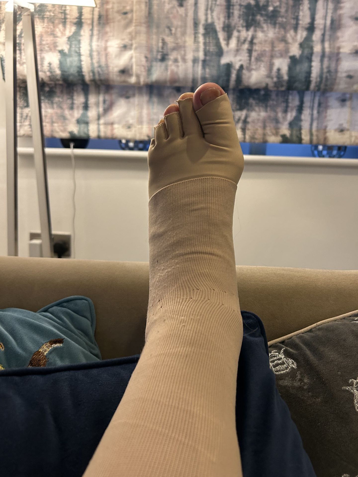 I use full-length made-to-measure compression stockings [Jobst Elvarex class 3], which I receive through both the NHS lymphoedema service and my private therapist- so it’s a mix of NHS-funded and privately purchased compression garments. I also use wraps [Jobst FarrowWraps] and a night-time garment [Haddenham Comfiwave], which helps maintain progress overnight.