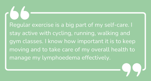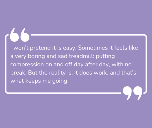 My treatment plan is a combination of NHS and private care. The main focus of my lymphoedema management is compression. I wear compression just about 24 hours a day - the only time I don’t is when I’m in the shower! It’s something I’ve learned I need to be really consistent with, because compression is absolutely key to managing my lymphoedema. The routine might be relentless at times, but it’s what helps keep my leg under control and allows me to stay active and healthy.
